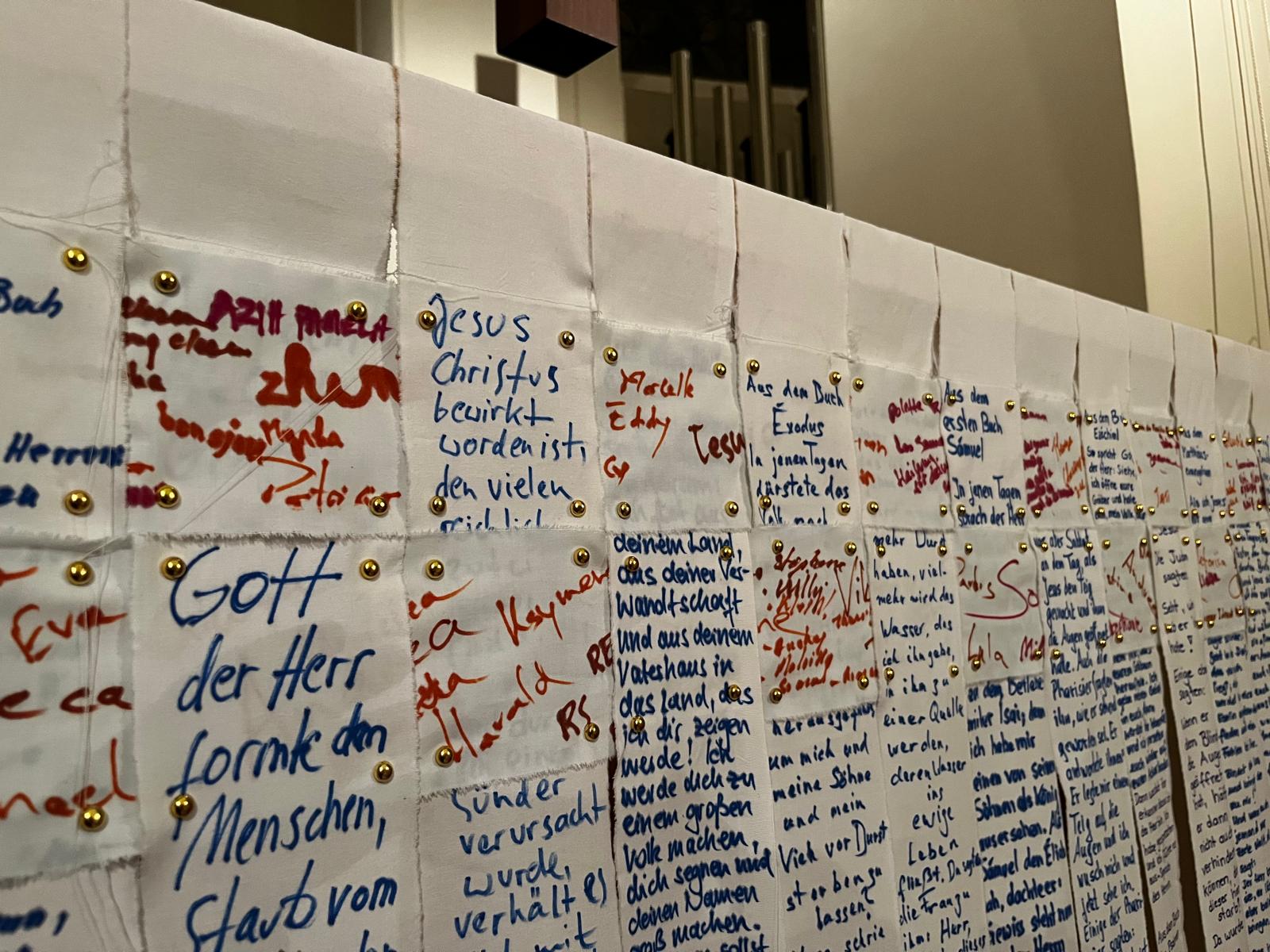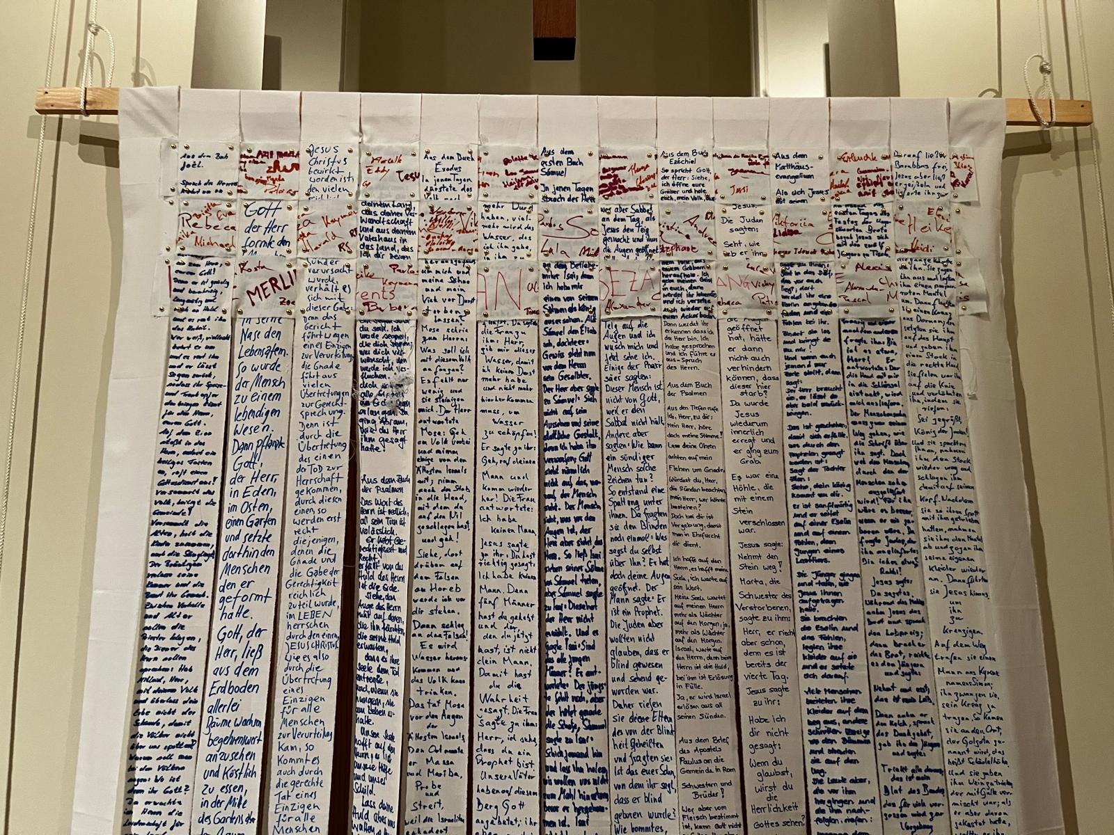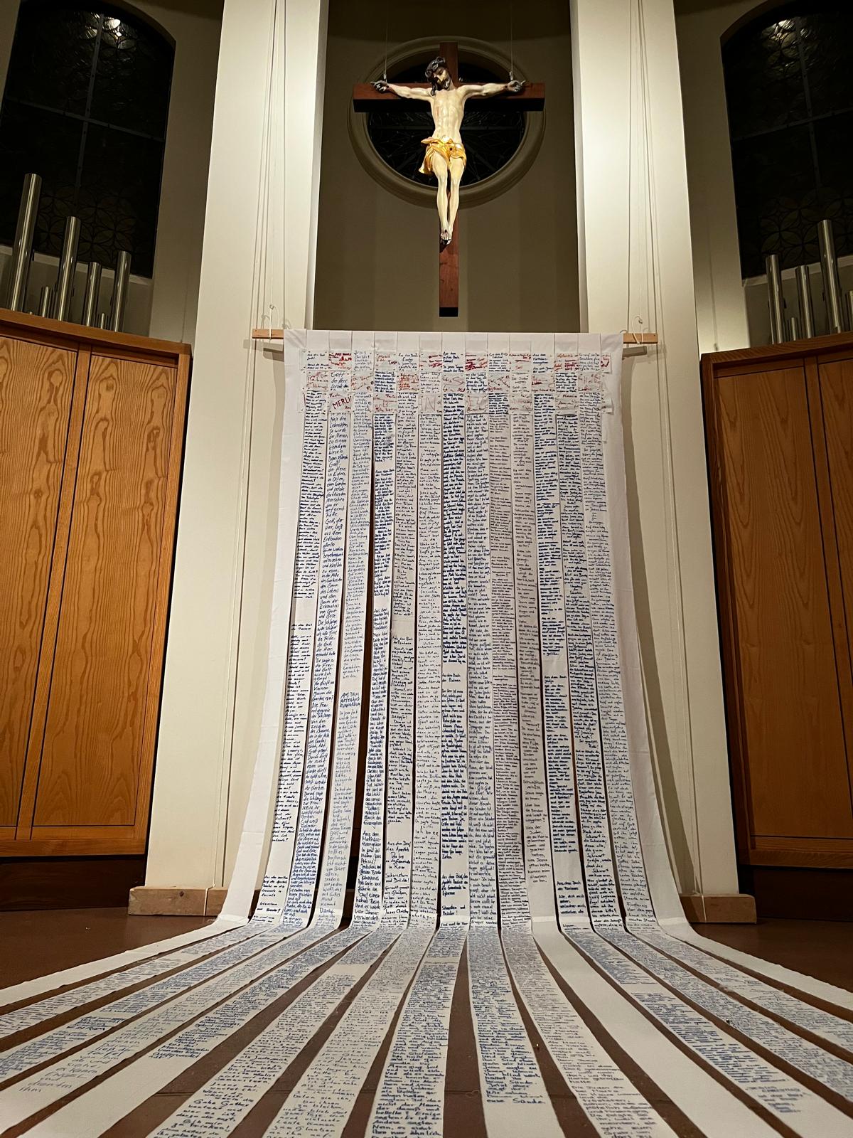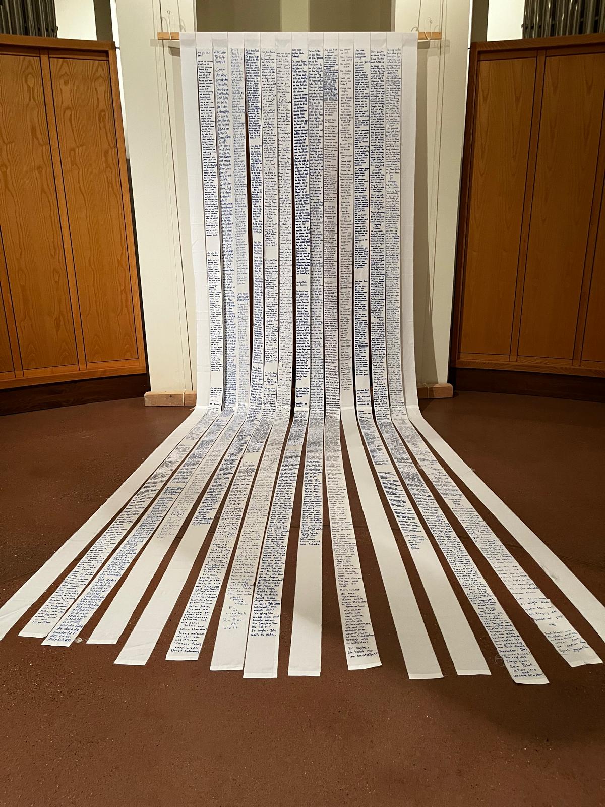 Die beiden anderen Leintücher wurden in Querstreifen gerissen. Sie liegen an den Wochenenden wie ein Fürbittenbuch im hinteren Bereich der Kirche aus oder gehen zurück in die Krankenhäuser bzw. an andere Orte des Hoffens und des Bangens. Menschen sind eingeladen Namen auf ihnen zu notieren, Bitten zu formulieren oder Gebete zu schreiben.