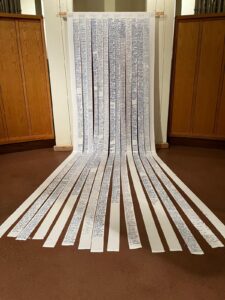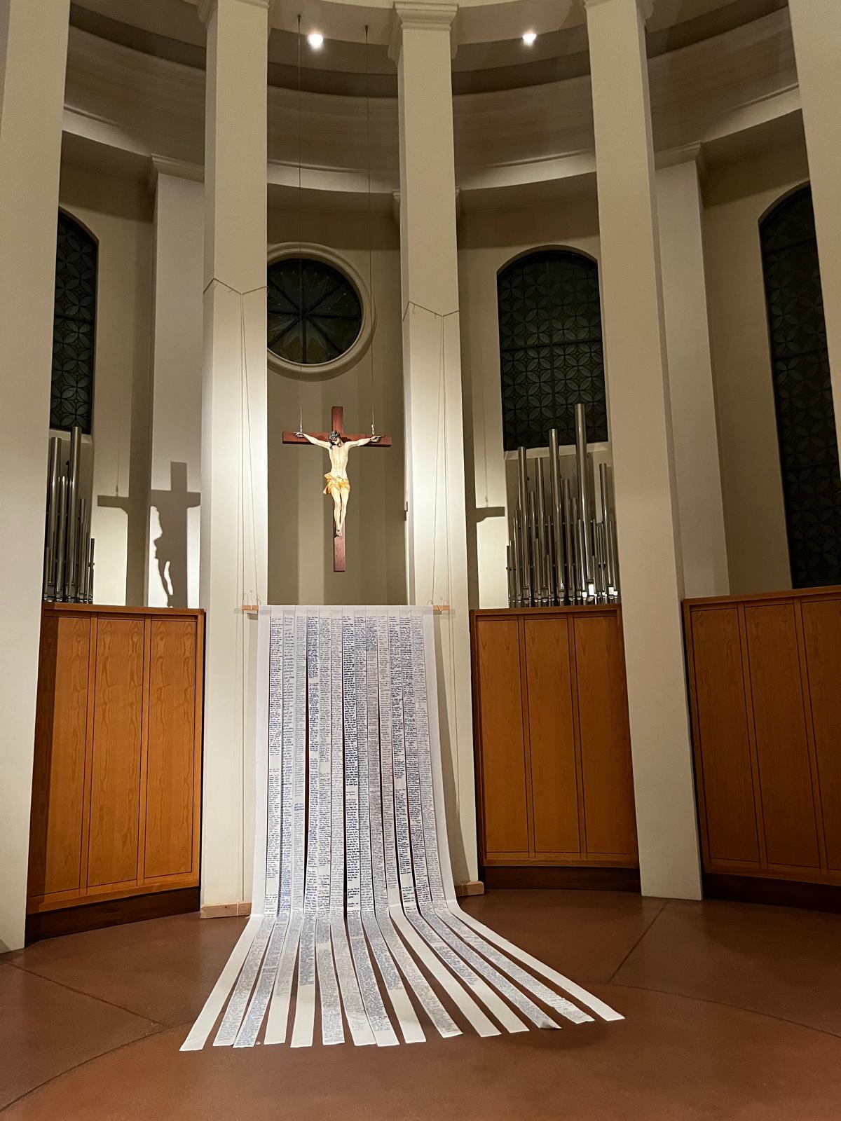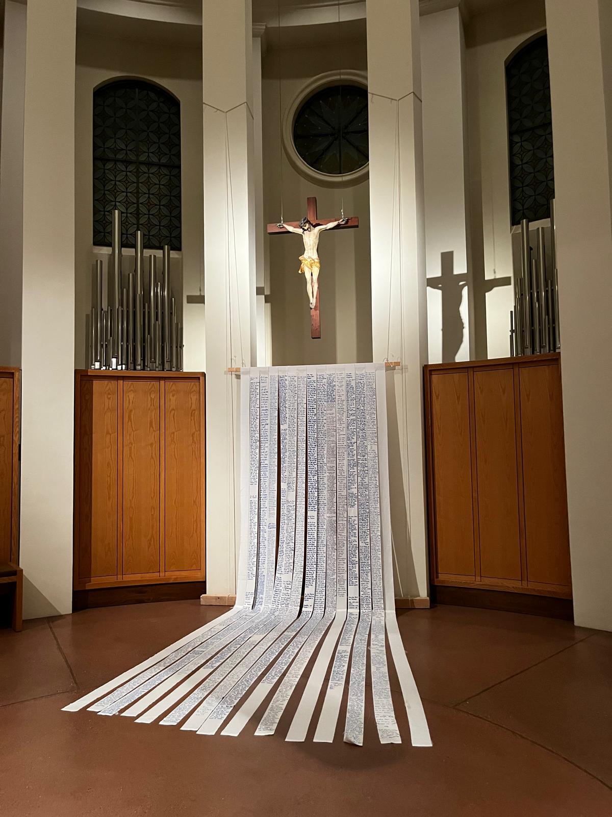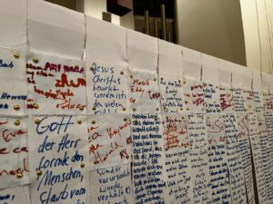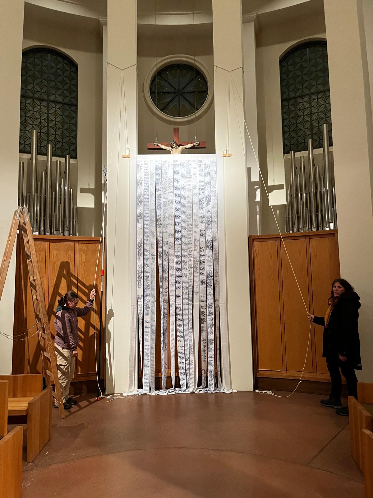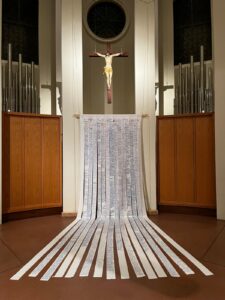 Die beiden anderen Leintücher wurden in Querstreifen gerissen. Sie liegen an den Wochenenden wie ein Fürbittenbuch im hinteren Bereich der Kirche aus oder gehen zurück in die Krankenhäuser bzw. an andere Orte des Hoffens und des Bangens. Menschen sind eingeladen Namen auf ihnen zu notieren, Bitten zu formulieren oder Gebete zu schreiben.