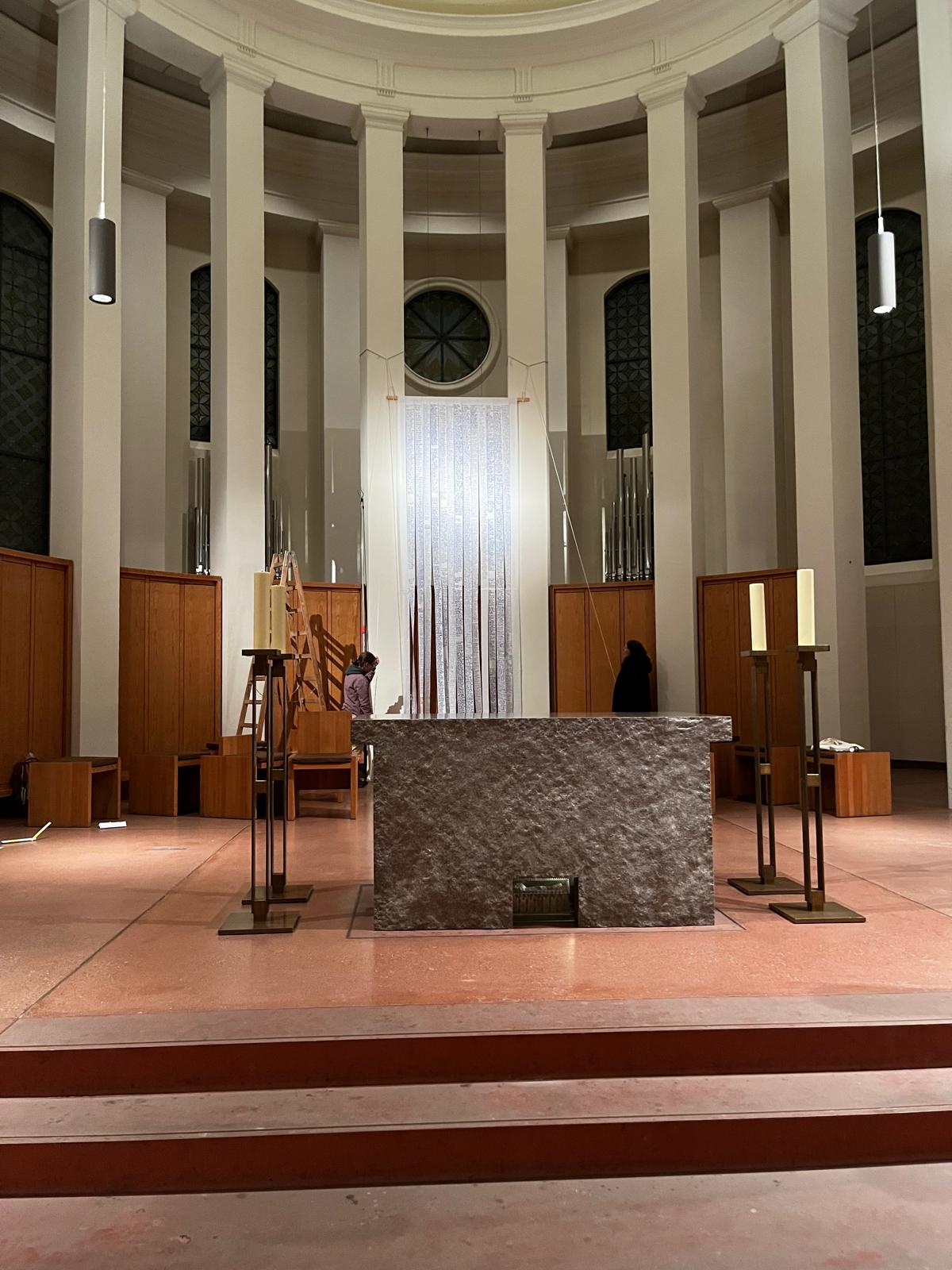 Im Altarraum des Kleinen Michel entsteht ein Hungertuch, das im Laufe der Fastenzeit zur Kreuzverhüllung wird.