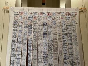 Zwei der Leintücher wurden in Längstreifen gerissen und aneinander-genäht. Auf sie wurde die Heilsbotschaft der Fastenzeit geschrieben – sämtliche Lesungstexte von Aschermittwoch, über die fünf Fastensonn-tage bis zu Palmsonntag…